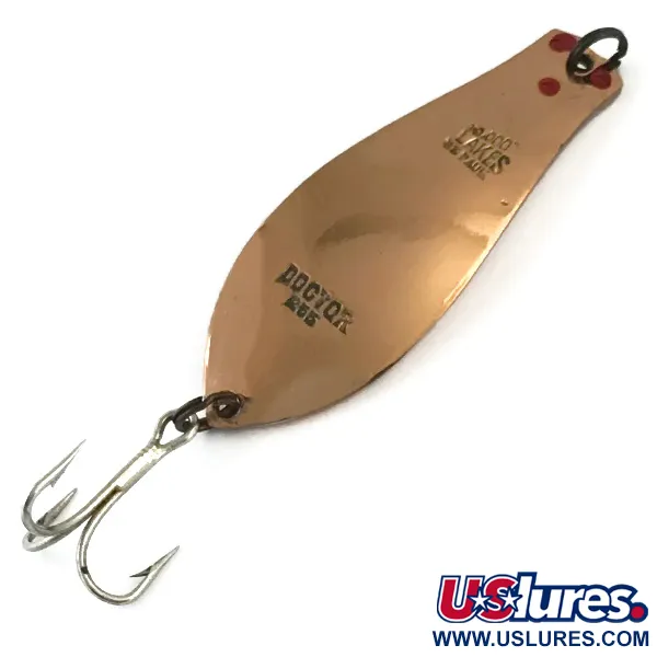 Koppartoner dominerar finishen på detta 1 3/4" (4,7 cm) skeddrag, som fångar ljuset med en spegelliknande glans. Little Doctor 255 (Produktkod: 5917) är tillverkad i USA och har tydliga stämplar på kroppen som framhäver dess arv från de Stora sjöarna. Med en vikt på 1/4 oz (7 g) ger metallkonstruktionen en solid profil för spinnfiske eller lätt trolling. Den övre änden är prydd med tre distinkta röda prickar nära fjäderringen, en klassisk huggpunkt som ofta återfinns på dessa vintagemodeller. En enkel trekrok är säkrad med en robust fjäderring i botten, och det allmänna skicket på detta exemplar är 5/5 med mycket välbevarade ytor.