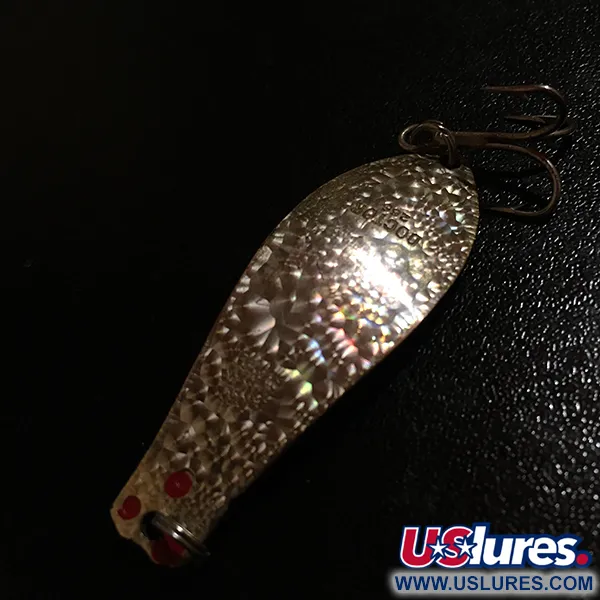 Hamrade texturer på baksidan av den 1/4oz (7g) tunga metallkroppen kontrasterar vackert mot den sällsynta gyllene Crystal-holografiska finishen på framsidan. Tydligt stämplat i metallen finns markeringarna 10,000 LAKES ST. PAUL tillsammans med modellbeteckningen DOCTOR 255, vilket identifierar dess ursprung från Prescott Spinner i Minnesota, USA. Med en längd på 1 3/4" (4,7 cm) är detta exemplar i exceptionellt skick, betygsatt 5/5, med sin reflekterande gyllene yta och röda accenter intakta. Konstruktionen inkluderar en standard trekrok monterad vid basen, designad för spinnfiske eller trolling. Denna specifika version, identifierad med produktkod 5470, sticker ut tack vare de unika ljusfångande egenskaperna hos dess guld-kristalltexturerade framsida.
