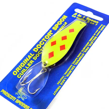 Iögonfallande röda diamanter kontrasterar skarpt mot den klargula basen på detta 1/3 oz (10 g) skeddrag. Little Doctor 265, med produktkod 0780, mäter 2 1/2" (6,5 cm) och ligger kvar i sin ursprungliga blå kartongförpackning. Detta specifika exemplar är oanvänt, vilket bevarar den fabriksnya emaljen och den vassa trekroken. Som en produkt från Prescott Spinner, en division av det välkända Fred Arbogast-företaget, bär detta USA-tillverkade bete den klassiska beteckningen '2 in 1 Spoon' på förpackningen. Den gula finishen ger hög synlighet, medan namnet 'Doctor Spoon' och varumärket är tydligt stämplade i metallens baksida.