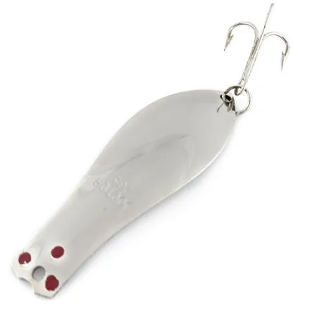 Med en vikt på 10g (1/3 oz) visar detta förnicklade skeddrag från Prescott Spinner prov på den hållbara kvaliteten hos amerikanska fiskeredskap från mitten av seklet. Little Doctor 265 mäter 6,5 cm (2 1/2 tum) i längd och har en ren konvex framsida där modellnamnet är tydligt instämplat i metallen. Tre tydliga röda prickar är placerade nära linöglan, vilket ger en skarp visuell accent mot den reflekterande silverfärgade kroppen. Detta exemplar är i skick 5/5 och uppvisar en blank, felfri yta som behåller sin ursprungliga lyster. Draget är utrustat med en robust trekrok monterad med fjäderring, en konfiguration utformad för både spinnfiske och trolling. På baksidan har metallen en matchande slät nickelfinish, vilket speglar den enkla men effektiva konstruktionen från denna USA-baserade tillverkare.