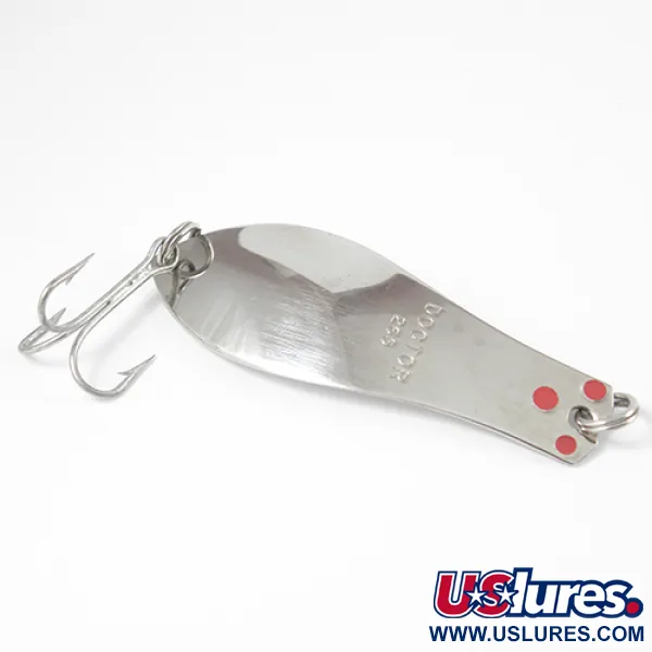 Förnicklingen på detta 6,5 cm långa skeddrag reflekterar ljuset med en ren, spegelliknande finish som är typisk för högkvalitativa Prescott Spinner-beten. Den tydligt instämplade identifieringen "DOCTOR 265" åtföljs av tre karakteristiska röda prickar nära fästöglan. Med en vikt på 10 g är detta USA-tillverkade skeddrag konstruerat för spinnfiske eller trolling. Utrustningen inkluderar en vass trekrok och dubbla fjäderringar, allt i exceptionellt skick. Detta exemplar, listat under produktkod 2584, har ett skickbetyg på 5/5, vilket bevarar den ljusa nikkelfärgen över hela den långsträckta profilen. Den klassiska droppformen smalnar av mot toppen, där metallen är något smalare för lininfästningen.