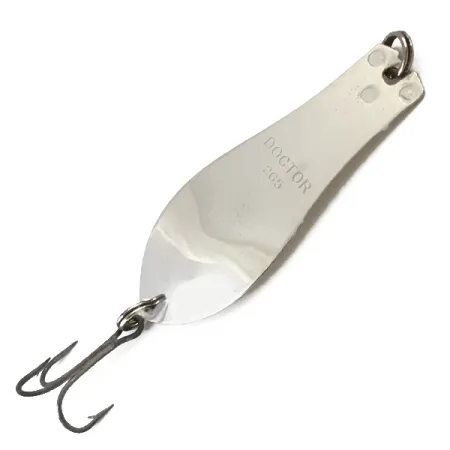 En längd på 2 1/2 tum (6,5 cm) kännetecknar detta Prescott Spinner skeddrag, en design som förblir en stapelvara för samlare av amerikanska fiskeredskap från mitten av seklet. Med en vikt på 1/3 oz (10 g) är metallkroppen stämplad med 'DOCTOR 265' på sin nickelpläterade framsida, vilket markerar dess arv som en del av Fred Arbogast-familjen av beten. Detta exemplar, identifierat med produktkod 4904, har en distinkt tvåfärgad finish med polerad nickel på framsidan och en guldpläterad baksida. Hårdvaran inkluderar en robust fjäderring för lininfästning och en vass trekrok säkrad med en fjäderring i stjärten. Med betyget 5/5 är ytorna exceptionellt rena och visar den ursprungliga lystern hos båda metallfinisharna. Tillverkningen skedde i USA och följde tidens höga produktionsstandarder.