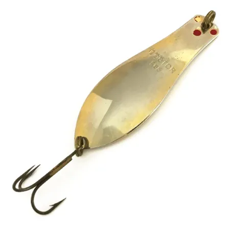 Med en vikt på 1/3 oz (10 g) är detta skeddrag ett mångsidigt val för en mängd sötvattensarter. Namnet 'DOCTOR 265' är tydligt stämplat i den guldpläterade metallen, vilket identifierar det som ett klassiskt USA-tillverkat bete. Med en längd på 2 1/2" (6,5 cm) har detta exemplar två tydliga röda prickar nära den övre öglan, vilket ger en visuell kontrast mot metallkroppen. Utrustningen består av en robust trekrok fäst med en fjäderring i bakänden, samt en matchande fjäderring i framänden för lininfästning. Under produktkod 7693 visar guldpläteringen lätta spår av användning men håller ett skick på 4/5. Den konvexa sidan behåller sin glans, medan den konkava baksidan har en något mattare, åldrad guldton som är typisk för metallbeten från denna era.