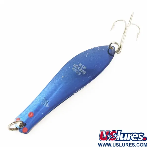Detta exemplar utmärks av en slående blå metallicfinish som ger en livfull kontrast mot den blanka nickelpläteringen. Denna Little Doctor 275, tillverkad av Prescott Spinner i USA, är ett rejält skeddrag som väger 21 g (3/4 oz) och mäter 9 cm (3 1/2"). Tre tydliga röda prickar är placerade nära den nedre fjäderringen och fungerar som en klassisk huggpunkt som sticker ut mot färgkombinationen Ljusblå / Nickel / Blå. Dragets framsida är tydligt stämplad med modellnamnet och det är katalogiserat under produktkod 24207. Både metallkroppen och trekroken är i utmärkt skick, vilket ger detta exemplar ett stabilt betyg på 5/5. Det är ett välbevarat exempel på amerikansk fiskehistoria med en droppformad design skapad för effektivt spinnfiske eller trolling på djupet.
