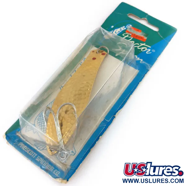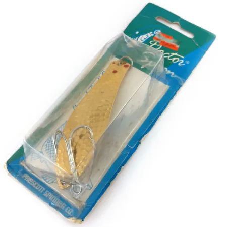 En hamrad guldplätering täcker hela ytan på detta 9 cm (3 1/2") skeddrag, som pryds av distinkta röda prickar vid den övre öglan. Med en vikt på 21 g (3/4 oz) är Little Doctor 275 en klassisk och mångsidig design från Prescott Spinner Co., som senare blev en del av KOTCO Manufacturing i Akron, Ohio. Detta specifika exemplar, med produktkod 9748, ligger kvar i sin ursprungliga vintage blisterförpackning. Draget är oanvänt och uppvisar den ljusa, reflekterande kvaliteten hos den hamrade metallfinishen. "Doctor"-serien är känd för sin mångsidighet då den kan riggas från båda hållen; även om den här är utrustad med en kraftig silverfärgad trekrok i den breda änden, tillåter designen lininfästning i båda sidor för att ändra djup och motstånd vid trolling eller spinnfiske. Baksidan av förpackningen bekräftar dess effektivitet för större arter som gädda, musky och walleye.