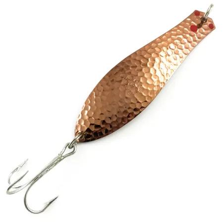 Hamrade kopparytor som på detta exemplar designades för att fånga och reflektera ljus i olika riktningar, en teknik som länge använts av den amerikanska tillverkaren Prescott Spinner. Med en vikt på 17 g (3/5 oz) har Little Doctor 275 Lite (Kod 6030) en distinkt hamrad yta på sin konvexa sida som kontrasterar mot den släta, polerade kopparen på baksidan. Två små röda färgdetaljer är placerade nära den övre linfästet och ger en subtil fokalpunkt mot den varma metalltonen. Draget är 9 cm (3 1/2") långt och utrustat med en kraftig silverfärgad trekrok som säkrats med en extra stark fjäderring. Tillverkarens stämpar är tydligt synliga i metallen och visar dess ursprung från USA. Detta exemplar är i utmärkt skick, med betyget 5/5, rena detaljer och en blank finish. Den grova kroken och den solida metallkroppen tyder på ett bete byggt för spinnfiske och trolling där hållbarhet är avgörande.