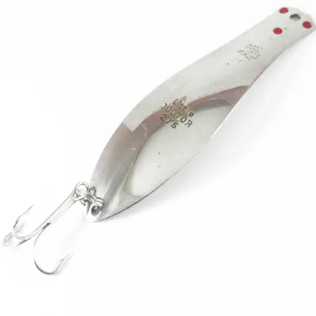 Med en vikt på 3/5 oz (16g) konstruerades denna specifika "Thin"-variant av Little Doctor för trolling, där en lättare och mer strömlinjeformad profil föredras framför tyngre kastmodeller. Den polerade nickelfinishen accentueras av tre distinkta röda prickar placerade nära linöglan, vilket är ett signaturdesignelement från Prescott Spinner-företaget i Prescott, Wisconsin. Skeddraget är 3 1/2" (9 cm) långt och framsidan är tydligt stämplad med modellbeteckningen "Little DOCTOR 27S" tillsammans med tillverkarens ursprung. Detta exemplar är i 5/5 skick och har kvar sin ljusa, reflekterande yta och den ursprungliga silverfärgade trekroken. Konstruktionen har en fjäderring vid stjärten för att säkerställa att hårdvaran sitter säkert under långa trollingpass. Draget är tillverkat i USA och representerar den funktionella enkelheten hos vintage-utrustning från mitten av seklet, med en avsmalnande kroppsform för att nå avsett djup utan överdriven volym. Undersidan har samma högblanka nickel, vilket ger konsekvent blänk från flera vinklar.