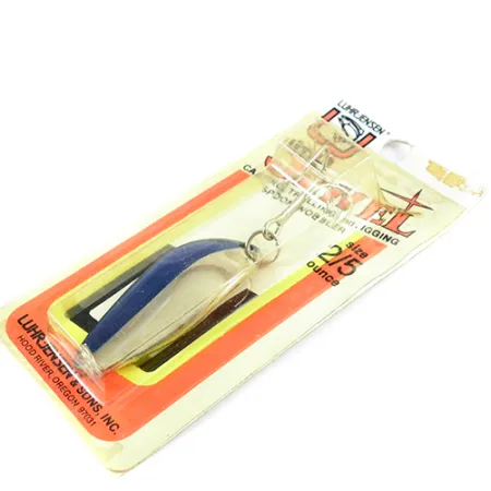 Detta vintage skeddrag i metall väger exakt 1/2 oz (14 g) och har ett klassiskt färgschema i Nickel / Blått som förblivit rent och blankt i sin originalförpackning. Detta exemplar av Luhr Jensen Little Jewel, identifierat med produktkod 2883, är oanvänt och sitter kvar på sitt autentiska fabrikskort från eran i Hood River, Oregon. Betet mäter 2 1/4" (5,7 cm) och dess konstruktion är anpassad för en mängd olika tekniker inklusive spinnfiske, trolling och jigging. Baksidan av kortet ger information om dess avsedda användning och rekommenderar det för djupt sjöfiske eller fiske i stora, strömmande vattendrag. Färgen anges specifikt på vintage-taggen som NKL/NEON BL ST, och skeden är utrustad med en robust fjäderring vid fästpunkten.