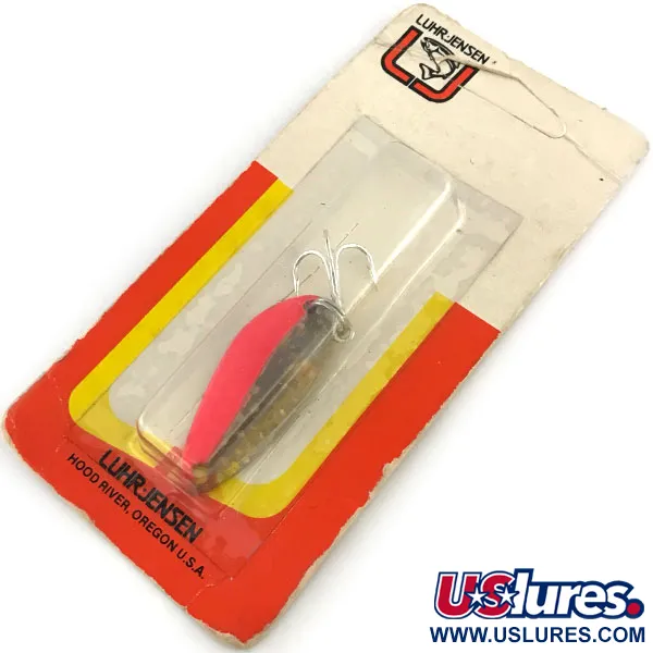 Hamrad mässingsstruktur på den konvexa sidan ger en högreflekterande yta som kontrasterar mot den livfulla fluorescerande röda finishen på framsidan. Med måtten 1 1/2" (4 cm) och en vikt på 1/4 oz (7 g) är detta vintage Luhr Jensen Little Jewel skeddrag en klassisk del av historien från Hood River, Oregon. Fortfarande säkrad i sin originalförpackning är skeden oanvänd, vilket motsvarar ett samlarskick i grad 6. Baksidan av kortet har kvar den ursprungliga streckkodsetiketten med produktkod 1013-014-399, som specifikt identifierar detta som en "Special Finish" tillverkad i 10-94. Den fluorescerande beläggningen är konstruerad för hög synlighet och reagerar under UV-ljus för att dra till sig uppmärksamhet på djupare vatten. Hårdvaran består av en blank silverfärgad trekrok och en robust fjäderring, typiskt för den hållbara konstruktion Luhr Jensen var känd för innan produktionen av denna modell upphörde. Detta exemplar fungerar som ett bevarat exempel på tillverkningsstandarder från mitten av 90-talet, från den litograferade grafiken till den specifika stansningen av metallen.