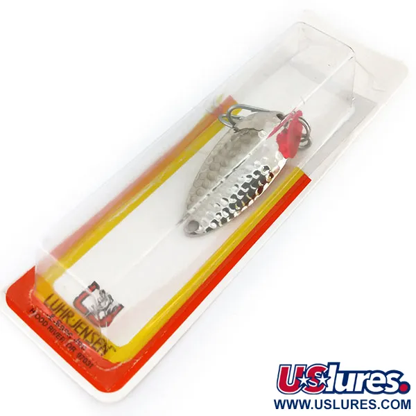 Den djupt texturerade ytan på den hamrade nickelkroppen ger en högblank profil åt detta 14g (1/2oz) skeddrag. Denna oanvända Luhr Jensen Little Jewel ligger i sin ursprungliga blisterförpackning, med den klassiska röd-gula grafiken från Hood River, Oregon-eran. En liten röd attraktor i plast är monterad på den bakre fjäderringen tillsammans med trekroken för att ge en visuell kontrastpunkt. Draget mäter 5,5 cm (2 1/4") i längd och identifieras med produktkod 9673 och SKU 1233-999-0101 på baksidan av kortet. Förpackningens baksida visar också ett tillverkningsdatum från 2005 och tvåspråkiga instruktioner, vilket framhäver det nordamerikanska arvet för detta vintage-drag.