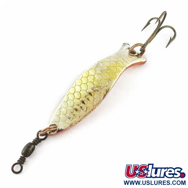 Med en vikt på lätta 7 g (1/4 oz) har den guldtonade ytan på detta skeddrag ett detaljerat pressat fjällmönster. Little Tilly (produktkod 24067) tillverkades under varumärket Record i Sverige och har en elegant, böjd fiskliknande profil. Metallytans undersida är målad i en kontrasterande orangeröd nyans. Betet är utrustat med en mörk lekare framtill och en vass trekrok baktill. Detta bete är i utmärkt skick (5/5), med välbevarade komponenter och en blank, reflekterande finish.
