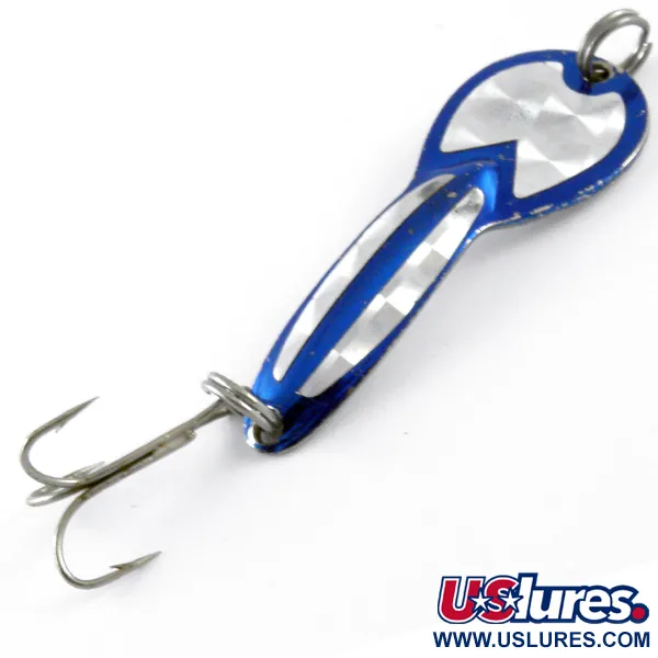 På baksidan av metallkroppen finns "LOCO"-identifieringen och storleksmarkeringen "2" instämplade. Med en vikt på 7 g (1/4 oz) och en längd på 5 cm (2") känns denna Glen Evans-klassiker igen på sin livfulla blå finish tillsammans med ett silverfärgat geometriskt holograminlägg. För samlaren som letar efter specifika varianter har denna modell produktkod 4400. Även om den är designad för spinnfiske eller trolling, är den särskilt lämpad för gäddfiske i stilla vatten på djup upp till 1 m (3,3 ft). Betet är känt för att ha en mycket aktiv gång vid invevning. När det gäller det fysiska skicket förblir den blå beläggningen ljus med visst mindre slitage synligt längs kanterna, vilket ger detta exemplar ett skickbetyg på 5/5. Det är utrustat med fjäderringar av originalmodell och en vass trekrok.
