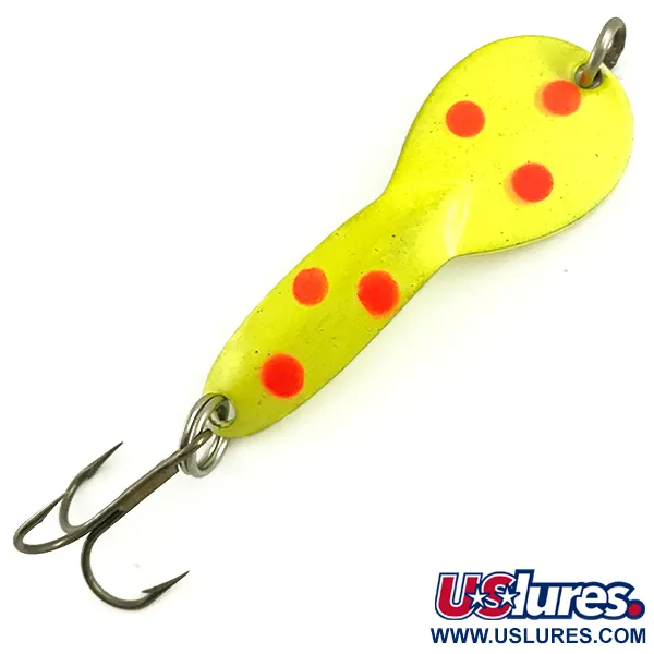 Sex distinkta röda prickar är precisionsplacerade över den fluorescerande gula framsidan på detta 7g (1/4oz) Glen Evans Loco 2 UV skeddrag. Med en längd på 5 cm (2") har denna specifika modell en högvisuell finish designad för att reagera på ultraviolett ljus, vilket är särskilt effektivt i grumligt vatten eller vid svaga ljusförhållanden. Baksidan avslöjar en ren nickelbas stämplad med identifieraren "LOCO 2" nära den övre öglan. Konstruerad för både spinnfiske och trolling, används detta bete vanligtvis för gädda i lugna vatten på djup ner till 1 m (3,3ft). Detta exemplar, katalogiserat under produktkod 5790, är i 5/5-skick där varken lack eller hårdvara visar några tecken på användning. Robusta fjäderringar håller en vass trekrok på plats i aktern, vilket säkerställer att den ursprungliga fabrikskonfigurationen förblir intakt.