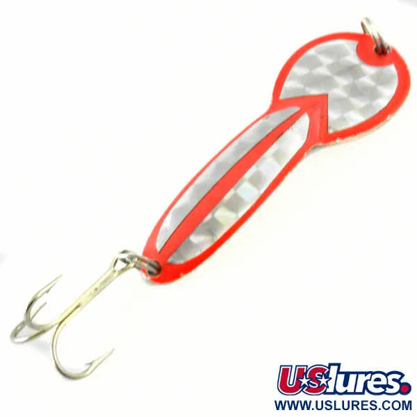 Med en vikt på 17 g (3/5 oz) har detta klassiska skeddrag en karakteristisk finish i fluorescerande orange och nickel med ett holografiskt rutmönster. Den 7 cm (2 3/4") långa kroppen är stämplad med namnet "LOCO" och storleken "3" på baksidan, ett signum för Glen Evans-företaget. Detta exemplar, med produktkod 4610, är i toppskick och får betyget 5/5 för sina rena ytor och välbevarade komponenter. Draget är utformat för både spinnfiske och trolling och är särskilt lämpligt för gäddfiske i stillastående vatten på djup upp till 1 m. Metallkroppen ger en solid känsla och den klara orangea kanten lyser starkt mot den reflekterande nickelbasen. En enkel trekrok är fäst med en kraftig fjäderring i bakänden, redo för fiske eller som ett tillskott i en samling av vintage-utrustning.