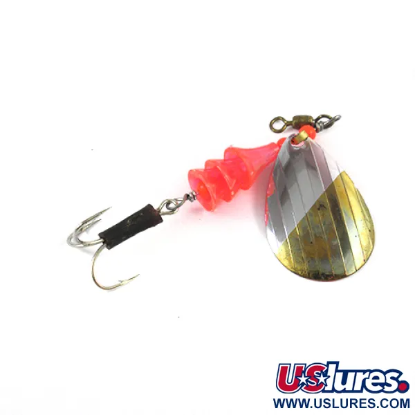 Denna klassiska kanadensiska spinnare mäter 8,25 cm (3 1/4 tum) från lekaren till krokböjen och kännetecknas av ett distinkt droppformat skedblad. Pläteringen på bladets framsida är delad mellan polerad nickel och mässing, medan baksidan har en solid röd beläggning. Lucky Strike, en hörnsten i den kanadensiska redskapshistorien, tillverkade Coffee Spoon (produktkod 2595) med en lättviktsprofil på 7 g (1/4 oz) som lämpar sig för olika sötvattensarter. En genomskinlig orange, trappstegsformad plastkropp utgör en visuell fokuspunkt längs trådstommen, som leder ner till en trekrok utrustad med ett svart skyddshölje. Detta exemplar är i 4/5-skick och uppvisar välbevarade ytor och ren hårdvara genomgående. En tunnelekare i mässing är redan monterad i den främre öglan för att underlätta linhantefteringen vid kast eller trolling.