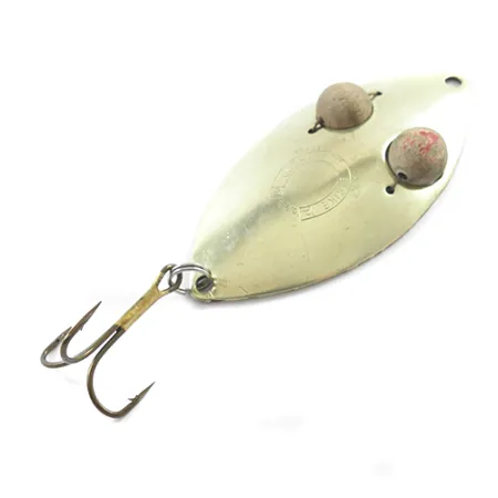 Detta skeddrag i mässing är 7,5 cm långt och representerar en fascinerande era av kanadensisk redskapstillverkning. De två träögonen, säkrade med metallstift, är en framträdande detalj på Lucky Strike Gold Red Flash (produktkod 1840) och ger en taktil, tredimensionell känsla åt den stansade metallkroppen. Med en vikt på 21 g ger dragets kraftiga gods en gedigen känsla vid utkast. Tillverkarens stämpel är tydligt synlig, präglad i mitten av skeden mellan ögondetaljerna. Detta specifika exemplar är i skick 4/5, med välvårdade metallytor och en robust trekrok fäst via en stadig fjäderring. Draget har sitt ursprung i Kanada och speglar den hållbara designfilosofi som är typisk för klassiska Lucky Strike-beten. Mässingskroppen ger ett stadigt blänk, medan de rödfärgade träpärlorna erbjuder en unik visuell kontrast som inte återfinns på moderna skeddrag.