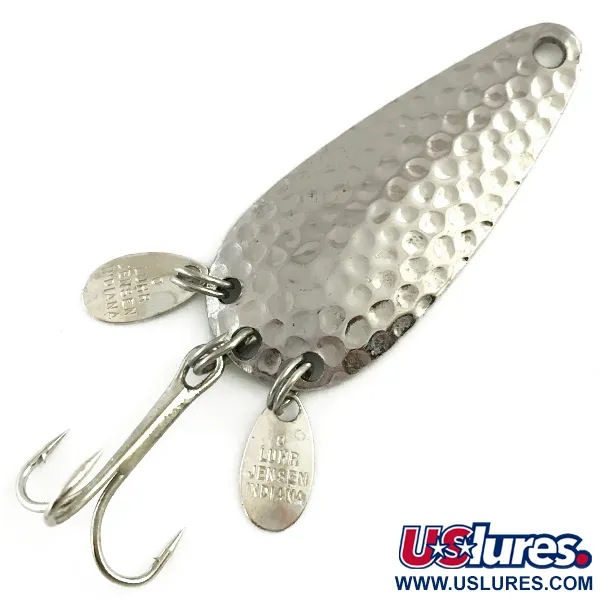 Hamrade nickelytor som den på detta Luhr Jensen skeddrag är ett klassiskt val för att fånga ljus och skapa blänk. Detta USA-tillverkade skeddrag mäter 5 cm (2") och väger 9 g (1/3 oz), identifieras med produktkod 5814 och utmärker sig genom sin 'sonic blade'-konfiguration. Två små, ovala metallbrickor är monterade via fjäderringar vid dragets bas, placerade bredvid trekroken för att ge extra yta och metall-mot-metall-kontakt. Medan framsidan av betet är kraftigt hamrad för att sprida ljus, har baksidan en högpolerad slät yta. Båda sonic blades är tydligt stämplade med tillverkarens märke, vilket matchar det övergripande 5/5-skicket på denna välvårdade produkt. Den silverfärgade hårdvaran förblir blank och trekroken visar inga tecken på användning.