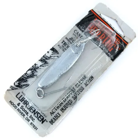 En vikt på 3/4oz (21g) ger denna metalljigg den densitet som krävs för att effektivt nå måldjupet. Denna Luhr Jensen Crippled Herring har en klassisk Silver-finish och mäter 5,5 cm (2 1/4") i längd. Katalogiserad under produktkod 11073, levereras exemplaret i sin originalförpackning och är oanvänt. Den tvåspråkiga förpackningen betonar dess användbarhet för kastfiske, jigging och trolling, designad för att efterlikna rörelserna hos en skadad betesfisk. Tillverkad i USA vid anläggningen i Hood River, Oregon, levereras draget utrustat med en enkelkrok och en kraftig fjäderring. Dess robusta utförande och reflekterande yta är karakteristiska för den kvalitet som länge förknippats med namnet Luhr Jensen.