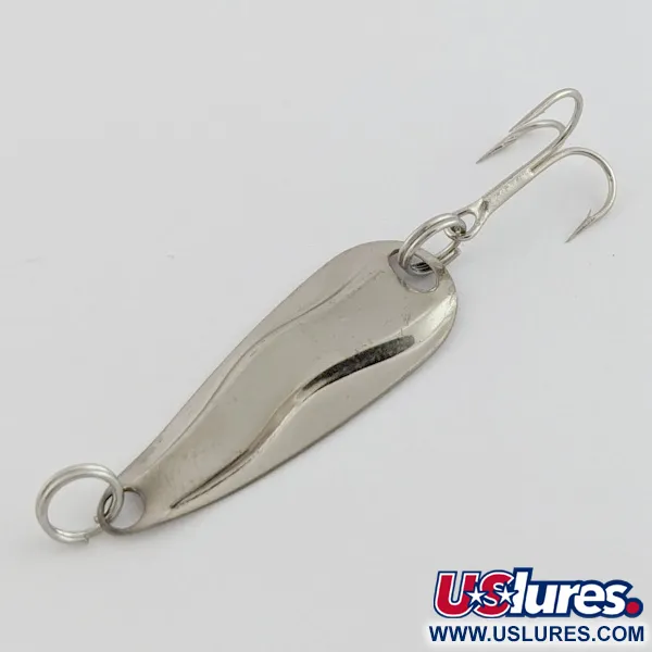 Tydligt stämplad med HOT SHOT W på baksidan, betes kroppen har en karakteristisk trippelkonturerad vågprofil som skiljer den från traditionella platta skeddrag. Detta Luhr Jensen-exemplar är utfört i högpolerad nickel, mäter 3 cm (1 1/4") i längd och väger nätta 1,3 g (3/64 oz). Hårdvarukonfigurationen inkluderar en fabriksmonterad trekrok och fjäderringar i både huvud och stjärt för mångsidiga riggningsalternativ. Denna modell är utformad för tekniskt spinnfiske eller lätt trolling i sötvatten och är ett specialiserat verktyg för öring- och steelhead-fiskare med lätta utrustningar. Metallytan är i utmärkt skick (betyg 5/5) och uppvisar en klar, reflekterande lyster över hela formen. Tekniska specifikationer för denna produkt finns registrerade under produktkod 24441.