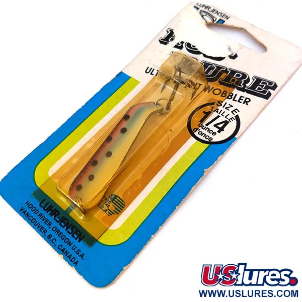 Detta vintage Hus-lure väger 1/4 oz (7 g) och representerar en klassisk era av Luhr Jensens produktion i Hood River, Oregon. Skeddraget mäter 2" (5 cm) och har ett detaljerat mönster av regnbåge, kännetecknat av sin gräddvita kropp, mjuka rosa sidolinje och spridda mörka fläckar. Exemplaret, som har produktkod 10637, sitter fortfarande kvar på sitt ursprungliga butikskort, vilket inkluderar historiska detaljer om tillverkarens katalog och kanadensiska distribution. Detta exemplar är oanvänt och har kvar sin ursprungliga fabriksfinish och hårdvara, inklusive trekrok och fjäderring. Förpackningen visar den klassiska blå, gula och vita grafiken som är synonym med varumärkets vintage-period.
