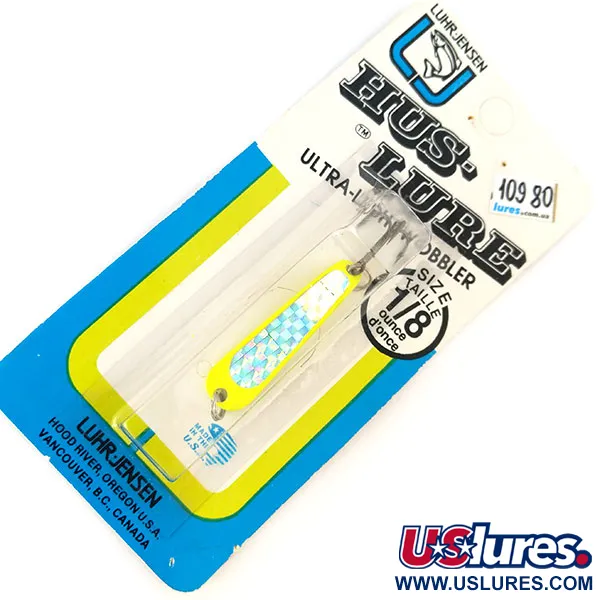 Med en vikt på 1/8oz (4g) är detta ultralätta Hus-Lure ett bevis på klassisk amerikansk tillverkning från Luhr Jensens anläggning i Hood River, Oregon. Det 1 1/2" (4cm) långa skeddraget har en levande Silver och Chartreuse-färgkombination, märkbart förstärkt av ett prismatiskt schackrutedesign på mittinsatsen. Klassad som en «Wobbler» på originalförpackningen, är dess konstruktion inriktad på lätt spinnfiske eller trolling. En viktig teknisk egenskap hos denna 10980-modell är den UV-aktiva fluorescerande ytan; under ultraviolett ljus lyser chartreuse-kanterna med hög intensitet för att ge synlighet i svagt ljus eller grumliga vatten. Detta exemplar är oanvänt och ligger kvar i sin ursprungliga vintageförpackning. Hårdvaran inkluderar en fabriksmonterad trekrok och en robust fjäderring, medan själva metallkroppen är stämplad med märket «Made in USA» på baksidan.