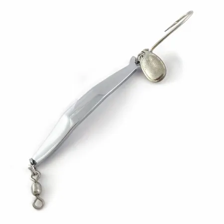 Med en vikt på 1/2 oz (14 g) representerar detta USA-tillverkade exemplar det specialiserade hantverket från Luhr Jensen-eran före Rapala. Den högblanka nickelfinishen på denna Kokanee King, produktkod 23916, är fortfarande anmärkningsvärt ljus och klar. Kroppen mäter 3 tum (7,5 cm) och har ett karakteristiskt litet droppformat metallblad placerat precis vid ögat på den fasta enkelkroken. Denna specifika design inkluderar ett robust lekvinde monterat i den främre öglan, avsett för den jämna spänningen vid trolling. Med tanke på dess skick (5/5) är metallytorna rena och fria från märken, vilket gör den till ett utmärkt exempel på denna USA-producerade raritet. Krokspetsen är fortfarande vass och i originalskick tack vare betets välbevarade tillstånd.