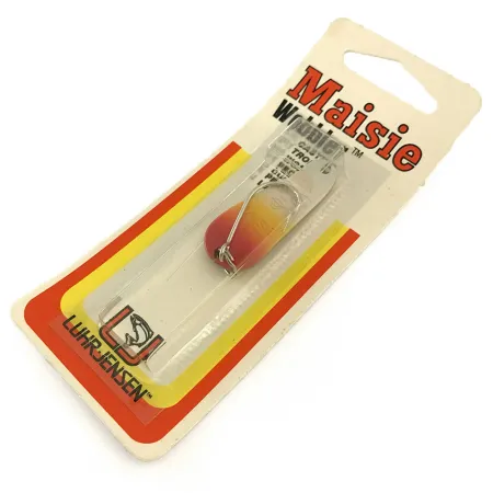 Med en vikt på 7 g (1/4 oz) är detta Luhr Jensen Maisie-skeddrag ett välbevarat stycke fiskehistoria från nordvästra USA. Färgmönstret Shoshone/Brass består av en livlig röd gradient som övergår i guldgult över mässingskroppen. Betet mäter 4 cm (1 1/2") och är oanvänt i sin originalförpackning. På baksidan av förpackningen finns en SKU-etikett, 1081-014-0603, som anger tillverkningsdatumet till den 11 december 2003. Denna modell, med produktkod 18029, är utrustad med en enkelkrok och en kraftig fjäderring. Förpackningen pryds av Luhr Jensens ikoniska logotyp med den hoppande öringen och bekräftar tillverkningen i USA. En blyvarning på baksidan ger en inblick i de material som användes vid tillverkningen av skeddraget under den perioden.