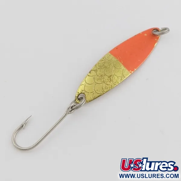 Mässingsmönster etsade i den guldfärgade sidan på detta 3,5 cm (1 1/2") långa skeddrag ger en klassisk textur designad för att reflektera ljus i vattenpelaren. Med en vikt på 2 g (1/16 oz) har metallkroppen en klar röd lackering på den nedre halvan som skapar en högkontrastpunkt för insjööring. Baksidan visar tydligt den stämplade Luhr Jensen Hood River, Ore.-märkningen och modellnamnet Needlefish, vilket speglar tillverkningsstandarden i USA. Detta tunna skeddrag är konstruerat för trolling i hastigheter runt 2,5 km/h (1,5 mph) och fungerar utmärkt i svalt vårvatten när det körs ca 30 m (100 fot) bakom båten på 8–10 lb lina. Klassat i skick 5/5, fabriksfinish och stämpling är fortfarande skarpa och välbevarade på denna specifika vara, produktkod 24513.