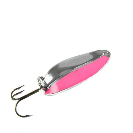 Detta exemplar mäter 5 cm (2") i längd och uppvisar det klassiska amerikanska metallarbetet hos en TODDCO Main Liner, identifierad med produktkod 0392. Skeddraget har en högglanspolerad nickelfinish med markerade, chockrosa ränder på utsidan, en färgkombination designad för synlighet i olika vattenförhållanden. Med en vikt på 11 g (2/5 oz) kombineras dess kraftiga profil med en förstärkt fjäderring och en vass trekrok, kännetecken för tillverkarens bruksorienterade designfilosofi. Detta specifika drag från USA är i 5/5-skick och har en ren, blank yta över sin droppform. Kontrasten mellan den reflekterande silverfärgade metallen och den mättade rosa färgen förblir skarp och väldefinierad.