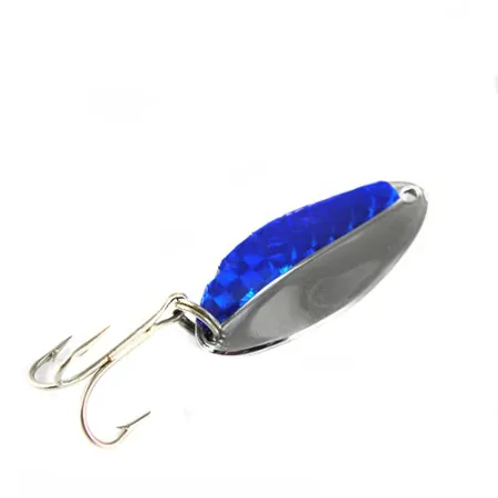 Ett iögonfallande blått prismatiskt fjällmönster täcker hälften av den polerade nickelkroppen på detta klassiska amerikanska skeddrag. Tillverkat av TODDCO under modellnamnet Main Liner (produktkod 0395), speglar betet en period av hållbar och högkvalitativ tillverkning i USA. Med en längd på 5 cm (2") och en mångsidig vikt på 11 g (2/5 oz), är den droppformade metallkroppen designad för balanserade kast och trolling. Nickelfinishen är anmärkningsvärt blank och ger en kontrastrik bakgrund till det texturerade blå inlägget som löper runt den yttre kurvan. Utrustningen inkluderar en stark, silverfinishad trekrok säkrad med en standard fjäderring i bakänden. Detta specifika exemplar är exceptionellt välbevarat utan tecken på slitage och har fått skicket 5/5. Öglan vid den smala änden är ren och perfekt cirkulär, typiskt för precisionsmaskinbearbetningen från denna era av sportfiskeproduktion.