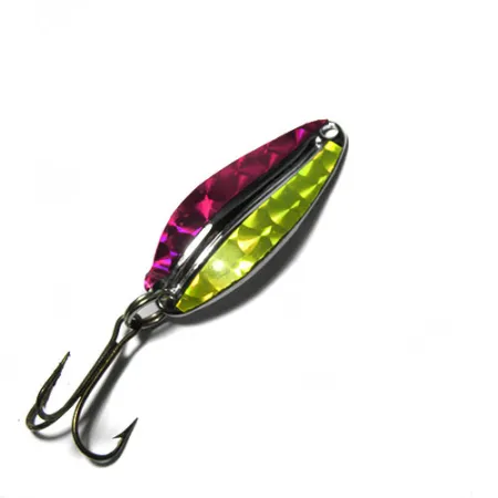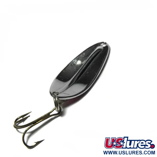 Segment i nickel, mörkröd hologram och fluorescerande gul hologram skapar ett slående visuellt mönster på skeddraget Main liner. Med måtten 4 cm (1 1/2") och en vikt på 7,5 g (1/4 oz), är denna amerikansktillverkade produkt från TODDCO byggd på en polerad nickelbas designad för att maximera blänket. Produktkod 0414 representerar en klassisk profil avsedd för spinnfiske eller trolling, utrustad med en robust fjäderring och en bronserad trekrok. Finishen är anmärkningsvärt välbevarad och har tilldelats skicket 5/5 utan synliga skador på hologramfolien eller metallkanterna. Präglat på baksidan visar metallarbetet den precision som är typisk för USA-tillverkad fiskeutrustning från denna era, vilket säkerställer att skeddraget behåller sin strukturella integritet.