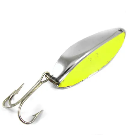 Halvbelagd i en levande fluorescerande grön färg mot en blank nickelyta, representerar detta Main liner från TODDCO ett klassiskt tillvägagångssätt för skeddrag. Med ett mått på 5,5 cm (2 1/4") uppvisar detta USA-tillverkade exemplar den enkla och effektiva design som definierade mitten av seklets funktionalitet. Draget väger 14 g (1/2 oz), vilket ger en rejäl tyngd för långdistanskast. På framsidan är nickelkroppen accentuerad med en diagonal applicering av fluorescerande grön färg, medan den konkava baksidan avslöjar en framträdande strukturell rygg för extra styvhet. En enkel fjäderring kopplar en vass trekrok till stjärten. Detta drag, med produktkod 0790, är i kondition 4/5 och uppvisar välbevarade ytor och en ren metallfinish. Kombinationen av högreflekterande plätering och färg med hög synlighet designades specifikt för sportfiskare som behöver synas i grumligt vatten eller vid sämre ljusförhållanden.