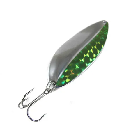 Med en längd på 6 cm (2 1/4") uppvisar denna Toddco Main liner en design som är typisk för klassiska amerikanska skeddrag från USA. Draget väger 21 g (3/4 oz) och är uppbyggt kring en droppformad metallkropp med en framträdande längsgående ås. Finishen på detta exemplar med produktkod 0823 är i tvåtoner: Nickel och Fluorescent Green. Medan ena sidan är i högglanspolerad nickel, är den motsatta sidan försedd med en prismatisk holografisk tejp i en klargrön nyans, utformad för att reflektera ljus från olika vinklar. Utrustningen inkluderar en vass trekrok fäst med en kraftig fjäderring i aktern. Klassad i skick 5/5, metalliterna och limmet på den holografiska panelen är i utmärkt form utan tecken på slitage. Denna utgångna modell representerar hantverket hos märket Toddco innan de upphörde med sin verksamhet.