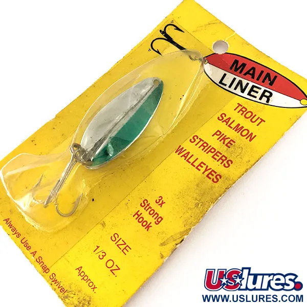 Med en vikt på 11 g (2/5 oz) och en längd på 5 cm (2") är Main liner-skeddraget en klassisk del av Michigans fiskehistoria från TODDCO Products. Färgkombinationen Nickel / Grön ger en tydlig kontrast på dragets yta, utrustat med en 3x stark krok byggd för kraftiga hugg från lax eller gädda. Identifierad med produktkod 12335, är betet oanvänt och ligger kvar i sin ursprungliga vintageförpackning, med ett skickbetyg på 6. Utformat för fiske på djupet, fungerar det lika bra för spinnfiske som för trolling. Baksidan av förpackningen intygar ursprunget från Grand Rapids, vilket bekräftar dess äkthet som ett amerikansktillverkat bete från före 1980-talet.
