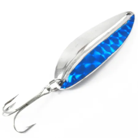 Nickelplätering täcker ena hälften av kroppen, medan den andra sidan har en livfull blå texturerad insats som fångar ljuset. Med en vikt på 12,5 g (2/5 oz) mäter TODDCO Main liner kompakta 5,5 cm (2 1/4"). Sportfiskare kommer att känna igen hantverket i detta amerikanska drag, som tillverkades i USA fram till 1980 under produktkod 3395. Skeddragets långsmala profil tyder på en mångsidig design för både spinnfiske och trolling. En närmare titt på komponenterna avslöjar en robust fjäderring som håller en vass trekrok, redo för fiske eller samling. Detta exemplar är i utmärkt skick med betyget 5/5, och de reflekterande ytorna har behållit sin ursprungliga lyster. Toddcos filosofi för "Main liner"-serien kombinerade traditionellt metallarbete med moderna färgdetaljer, ett kännetecken som syns i denna specifika Nickel / Blå-finish.
