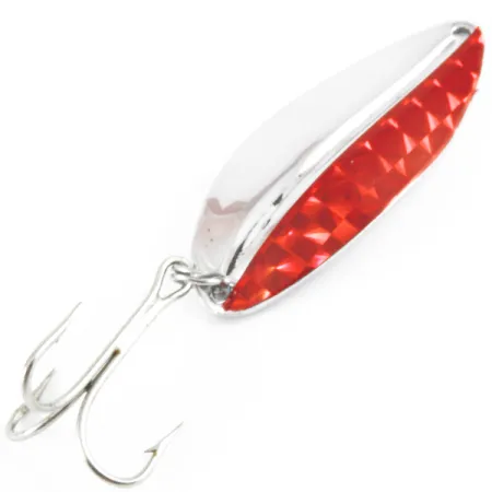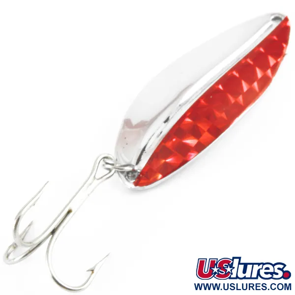 Detta vintage amerikanska skeddrag väger 12,5 g (2/5 oz) och visar hantverket från TODDCO, en tillverkare som avslutade sin produktion i USA omkring 1980. Ett livfullt, diamantmönstrat rött inlägg skapar en skarp visuell kontrast mot den högpolerade nickelkroppen, som mäter 5,5 cm (2 1/4") i längd. Denna Main liner, identifierad med produktkod 3671, har en klassisk droppformad silhuett med en ren, konkav baksida och ett fästhål i den smala änden. Utrustningen inkluderar en silverfärgad trekrok monterad med fjäderring. Detta exemplar är i skick 5/5 och uppvisar en välbevarad metallisk finish och säkert fäst prismatisk röd tejp.