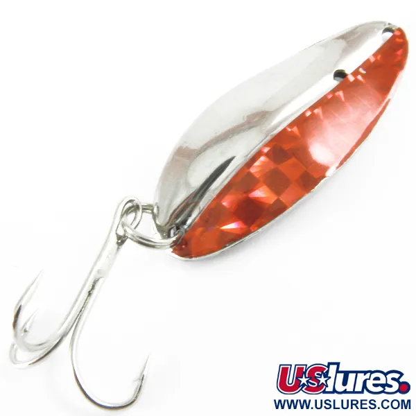 Med en längd på 5 cm (2") har TODDCO Main liner en kompakt profil. Detta klassiska amerikanska bete tillverkades fram till 1980. Skeddraget väger 11 g (2/5 oz) och har en iögonfallande längsgående delad finish på sin konvexa sida, där polerad nickel möter ett livfullt rött holografiskt klistermärke. Folieens schackrutor ger en geometrisk textur som kontrasterar mot den släta metallen på den andra halvan och den helt förnicklade konkava sidan. Identifierat med produktkod 3684 är detta exemplar i 5/5-skick och behåller en ren och reflekterande yta på alla sidor. Betet är utrustat med en klassisk trekrok vid den breda bakändan, medan den avsmalnande nosen har två separata hål för olika tacklingsbehov.