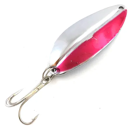 En distinkt vikt på 2/5 oz (12,5 g) ger Main liner från TODDCO dess tyngd för kast och trolling. Detta specifika exemplar, katalogiserat med produktkod 5244, uppvisar en klassisk amerikansk design från en tillverkare som producerade dessa drag i USA fram till 1980. Skeddraget, som mäter 2 1/4" (5,5 cm) i längd, har ett slående Nickel / Red-färgschema där ena sidan är uppdelad mellan polerad nickel och en livlig röd-rosa genomskinlig rand. Baksidan har en ren, enhetlig nikkelfinish med en framträdande central rygg som ger strukturell stabilitet åt metallkroppen. Utrustningen består av en vass trekrok fäst via en fjäderring i stjärten. Draget är i 5/5-skick och behåller sin ursprungliga metalliska lyster och färgkvalitet.