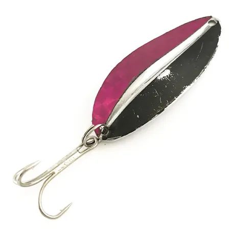 Med en längd på exakt 5,5 cm (2 1/4") är denna Toddco Main liner ett klassiskt stycke amerikansk sportfiskehistoria tillverkad i USA fram till 1980. Med en vikt på 12,5 g (2/5 oz) är skeddraget konstruerat med en tydlig central rygg som delar framsidan i zwei distinkta visuella halvor: en djup magenta prismafolie och en solid svart yta. Baksidan är i polerad nickel, vilket ger en högreflekterande yta som kompletterar den mörkare framsidan. Detta exemplar, identifierat med produktkod 6461, är i skick 4/5 och behåller en ljus lyster på metallytorna med endast obetydliga spår av ålder på de målade delarna. Originalmonteringen inkluderar en robust trekrok fäst via en fjäderring i rostfritt stål vid basen av den droppformade kroppen.