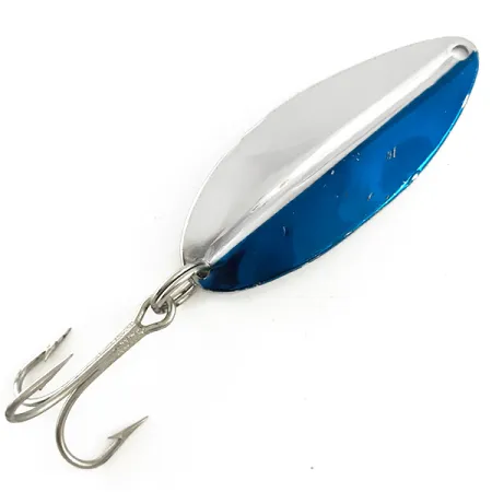 Ytor i nickel och blått delar framsidan på detta 12,5 g (2/5 oz) skeddrag, vilket skapar en högkontrastig visuell profil som var en storsäljare för TODDCO fram till produktionsstoppet 1980. Main liner mäter 5,5 cm (2 1/4 tum) och har en tydlig längsgående rygg som ger metallkroppen dess vridstyvhet. Detta drag är tillverkat i USA, bär produktkod 6493 och representerar en design avsedd för mångsidigt spinnfiske. Baksidan är utförd i ren, polerad nickel, medan framsidan har en klarblå accentrand längs ena halvan av bladet. Bestyckningen består av en robust trekrok fäst via en fjäderring i aktern. Detta exemplar håller skicket 4/5, med välbevarad plätering och endast mindre ytmärken som är normala för dess ålder. Ett enkelt linhål i nosen fullbordar den effektiva geometrin hos detta vintagefynd.