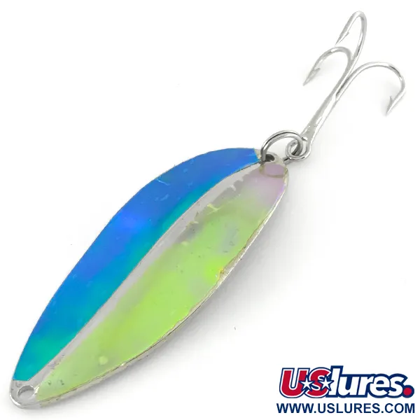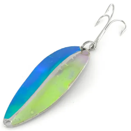 Detta USA-tillverkade skeddrag väger 3/4 oz (21 g) och har en karakteristisk kölliknande rygg längs hela den 2 1/4" (6 cm) långa kroppen. Main liner tillverkades av TODDCO i USA fram till 1980 och är än idag ett eftertraktat bete för samlare av metallbeten från mitten av seklet. Green / Nickel-finishen på detta exemplar, med produktkod 7020, uppvisar ett strålande iriserande skimmer på framsidan som skiftar från djupt blått till ljust limegrönt. På baksidan har draget en blankpolerad nickelyta för maximal reflektion. Betet är i skick 5/5, har kvar sin ursprungliga lyster och är utrustat med en kraftig, silverfärgad trekrok monterad med en robust fjäderring.