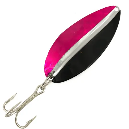 En vikt på 21 g (3/4 oz) ger Toddco Main Liner en betydande densitet för djuphavstrolling eller långdistanskast. Detta 6,5 cm (2 1/2") pilbladsskeddrag uppvisar en skarp, längsgående färgdelning på framsidan, med en mörkröd metallsida balanserad mot en helsvart halva. En polerad nickelsöm löper längs mitten och speglar den fullständiga nickelfinishen på metallens baksida. Detta USA-tillverkade bete, identifierat med produktkod 7337, representerar en klassisk era av Toddco-produktion som avslutades 1980. Terminalutrustningen är en vass trekrok säkrad med en fjäderring, och det allmänna skicket är klassat som 5/5. Den stansade öglan på toppen är rent borrad för direkta linjeknytar eller beteslås.