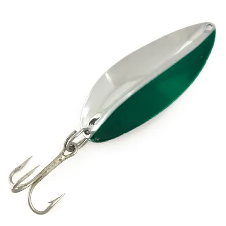 Med en vikt på 3/4 oz (21 g) har detta skeddrag i metall en klassisk amerikansk profil som var ett givet inslag i tackelboxarna tills produktionen upphörde 1980. TODDCO Main Liner, katalogiserad under produktkod 7486, mäter 2 1/2" (6,5 cm) och har en slående tvåfärgad finish i Nickel / Grön på sin konvexa sida. Den djupgröna färgen är applicerad med precision på ena halvan av betet, vilket skapar en högkontrasterande look mot det polerade nicklet. På den konkava baksidan visar skeden en enhetlig silverfärgad yta. Detta specifika exemplar är i skick 5/5 och bibehåller en klar glans på metallen och levande pigment på den målade sektionen. Maskinvaran består av en kraftig fjäderring och en vass, original trekrok. Tillverkat i USA, är betet ett robust exempel på design för spinnfiske och trolling från mitten av århundradet, och visar de rena linjer som är typiska för TODDCO:s tillverkningsstandard.