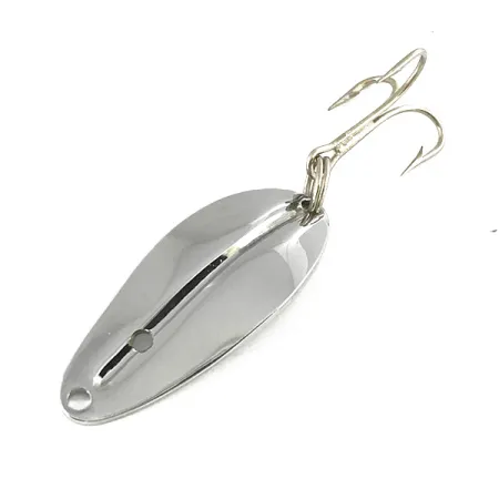 En förnicklad yta definierar exteriören på denna TODDCO Main liner, en design som förblev en stapelvara i tillverkarens amerikanska katalog tills produktionen upphörde omkring 1980. Med en vikt på 1/4 oz (7 g) mäter metallkroppen nätta 1 1/2" (4 cm) i längd och har en tydlig mittrygg som löper mot linögat. Detta specifika exemplar, identifierat med produktkod 7634, är i oanvänt skick och har kvar sin ursprungliga spegelglans. Det stansade skeddraget har en enskild cirkulär perforering nära toppen och är riggat med en vass, silverfärgad trekrok. Konstruktionen speglar de okomplicerade kastbetesdesigner som var typiska för den amerikanska sportfiskescenen under mitten av 1900-talet.