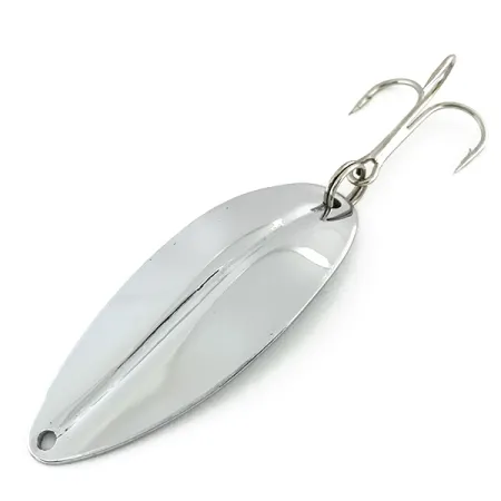 Förnicklingen ger en spegelblank finish på detta lövformade Main liner skeddrag, en design som TODDCO tillverkade i USA fram till 1980. Den 2 1/4" (5,5 cm) långa kroppen är stansad med en tydlig mittås som ger metallen extra stabilitet. Framtill finns ett rent stansat hål für direkt infästning av linan, medan baksidan av det 12,5 g (2/5 oz) tunga draget har en kraftig trekrok säkrad med en rejäl fjäderring. Skicket är graderat till 5/5 och ytan är fortfarande blank utan synligt slitage. Detta exemplar, med produktkod 8606, är ett gediget exempel på ett amerikanskt skeddrag från mitten av århundradet avsett för spinnfiske eller trolling.