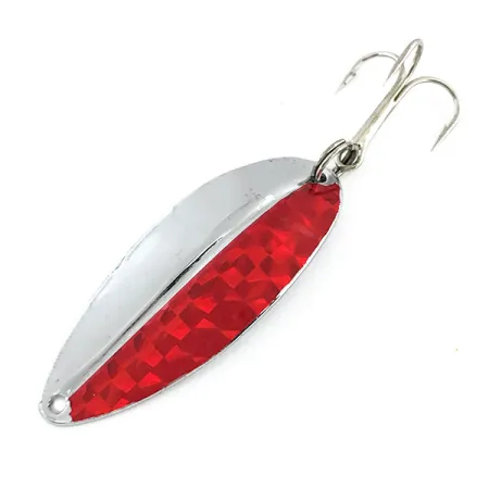 Nickel- och rödfärgade detaljer definierar estetiken hos detta klassiska amerikanska skeddrag tillverkat av Toddco. Main liner, som identifieras av produktkod 9377, har en tydlig längsgående rygg i mitten av bladet för ökad stabilitet. Draget är 5,5 cm långt, väger 12,5 g och består av en lövformad metallkropp med högblank förnickling på ena halvan och ett rött holografiskt rutmönstrat klistermärke på den andra. Detta exemplar återspeglar hantverket från eran innan Toddco upphörde med sin produktion omkring 1980 och har ett skickbetyg på 5/5. Utrustningen inkluderar en silverfärgad fjäderring i original kopplad till en vanlig trekrok, medan nosen har en ren fästpunkt för tafs eller beteslås.