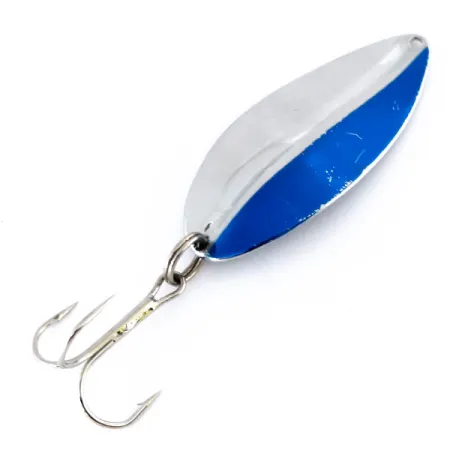 Framsidan av detta skeddrag är delad på mitten och ger en hög synlighetskontrast mellan reflekterande förnickling och en djupblå emalj. TODDCO Main liner, produktkod 9981, tillverkades i USA fram till 1980 och har en klassisk bladformad profil som lämpar sig för olika spinn- och trollingapplikationer. Med sina 21 g (3/4 oz) ger metallkroppen en rejäl densitet för sin kropp på 6,5 cm (2 1/2"), tillsammans med en stor trekrok säkrad med en robust fjäderring. Medan framsidan är tvåfärgad, är baksidan färdigställd i enhetligt polerad nickel över hela längden. Detta specifika exemplar förblir i utmärkt skick, vilket motiverar ett betyg på 5/5. Ett enda fästhål för linan är placerat vid den avsmalnande nosen på den 6,5 cm (2 1/2") långa plattan.