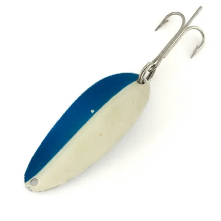 Detta TODDCO Main Liner Glow skeddrag väger 11 g (2/5 oz) och har en klassisk droppformad profil som var standard i amerikanska fiskelådor före 1980. Hälften av dragets framsida är djupt blå, medan den andra hälften har en speciell vit beläggning avsedd för synlighet i svagt ljus. Vid mörka förhållanden avger den vita sektionen en tydlig grön luminescens, en teknik TODDCO använde för att hjälpa sportfiskare att nå fisk i djupare eller grumligare vatten. Draget är 5 cm (2") långt, konstruerat på en polerad nickelbas och utrustat med en trekrok. Detta exemplar, med produktkod 7571, är oanvänt och har kvar sin ursprungliga lyster. En mycket liten flaga saknas nära mitten av den målade ytan, men draget förblir i utmärkt skick för visning med betyget 6. Baksidan är ren och speglar kvaliteten hos USA-tillverkade skeddrag från denna era.