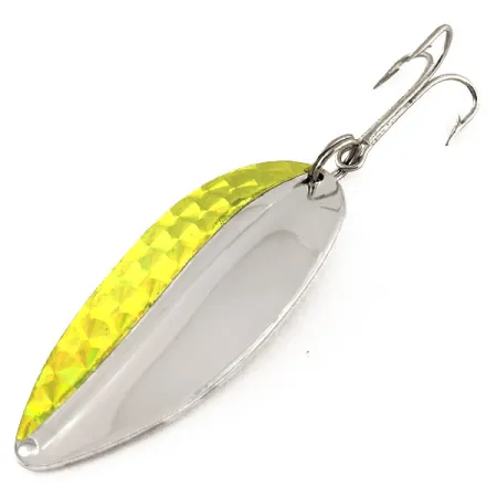 Detta skeddrag mäter 6,5 cm (2 1/2") och har en tvådelad ytdesign som kombinerar polerad nickel med en strukturerad, holografisk gul tejp. TODDCO Main liner UV på 21 g (3/4 oz) är konstruerad för betydande kastlängder eller för att nå specifika djup vid trolling. Dess färgskala "Nickel / Green" erbjuder en visuell dubbelverkan; medan ena sidan reflekterar ljus från den polerade metallen, är den fluorescerande tejpsidan utformad för att reagera på UV-ljus. Vid svaga ljusförhållanden avger denna specifika finish ett intensivt grönt sken, ett tekniskt kännetecken för produktkod 11434. Detta USA-tillverkade exemplar är i 5/5 skick och behåller sin ursprungliga fabriksglans och tydliga holografiska fjällmönster. En vass standard trekrok är fäst via en kraftig fjäderring i stjärten.