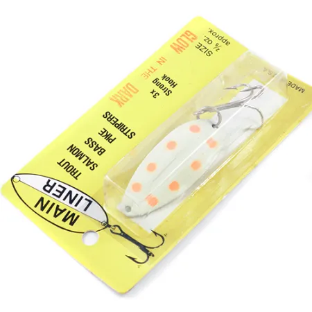Orange prickar sticker ut mot den vita självlysande basen på detta klassiska Toddco Mainliner skeddrag. Listat under produktkod 1892, är detta 2-tums (5 cm) bete från Toddco Products i Grand Rapids, Michigan, designat för djupt fiske vid trolling eller spinnfiske. Detta exemplar är i oanvänt skick och ligger kvar i sin originalförpackning, även om en fin spricka är synlig i mitten av lackeringen. Med en vikt på 11 g (2/5 oz) är skeddraget utrustat med en 3x förstärkt trekrok speciellt anpassad för lax, gädda och stripers. Den självlysande finishen var ett standardval för sportfiskare som fiskade i svagt ljus eller i djupare vattenlager där sikten är begränsad.
